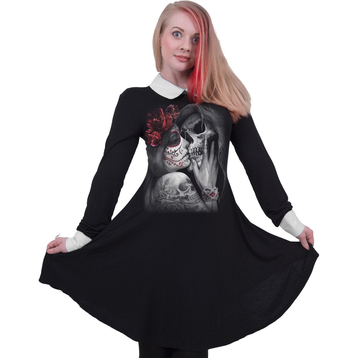 As she leans in for the chilling embrace of Death, one stolen moment of passion is granted before her final journey begins. PeterPan Collar Baby Doll LS Dress is made of 95% Viscose 5% Elastane, Jersey using skin friendly, Azo-free, Reactive dyes.