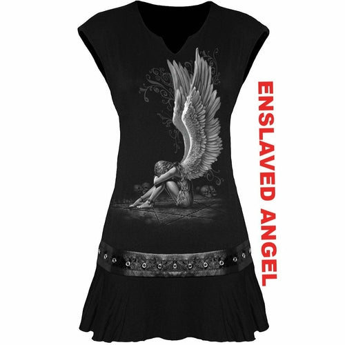 This chained, enslaved angel sits with her head hung in sorrow in the middle of a pentagram, surrounded by skulls of the dead. StudWaist Vscs Dress Blk is made of 95% Viscose 5% Elastane, Jersey using skin friendly, Azo-free, Reactive dyes.