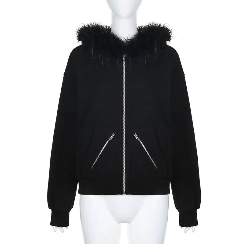 Goth Dark Faux Fur Collar Hooded Zip Up Hoodies Gothic Grunge Pockets
