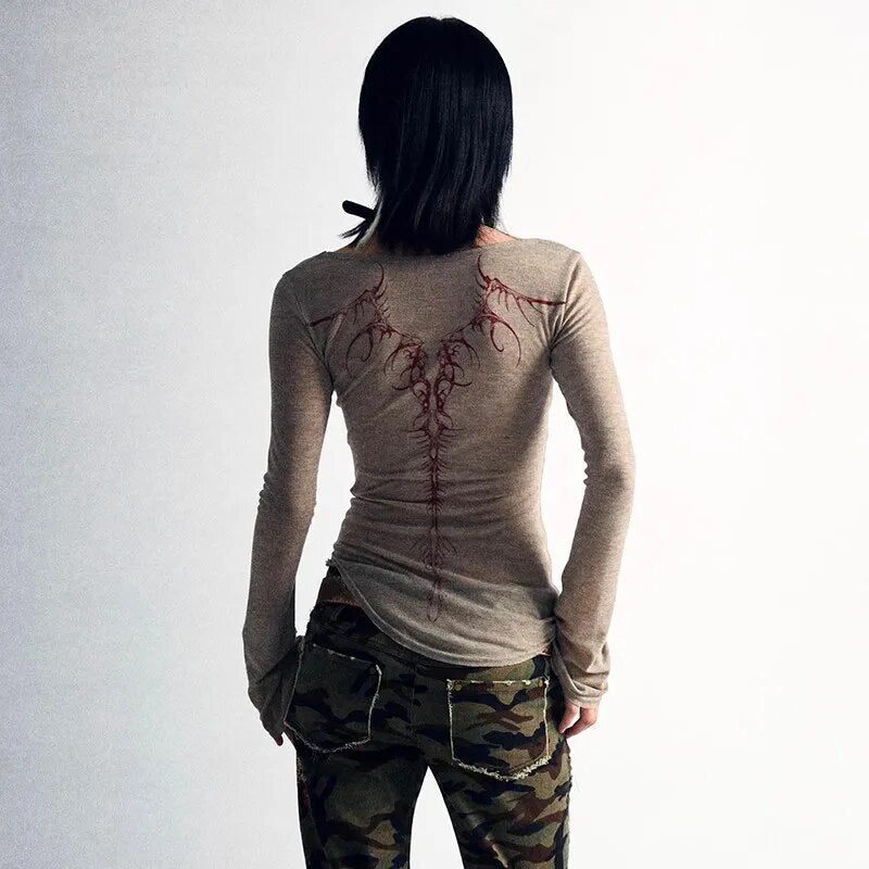 Karrcat Grunge Aesthetics Knitted Tops Vintage Tattoo Print T-shirt