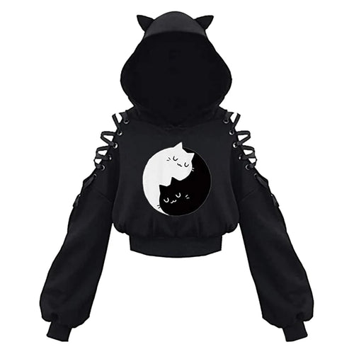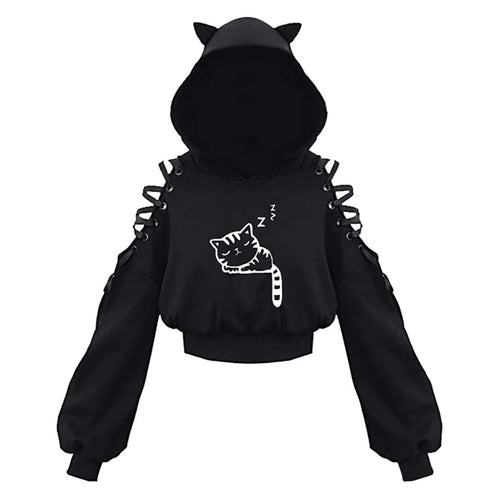 Y2k Gothic Womens Hoodie Cat Ear Crop Top Hooded Sweatshirt Hollow Out